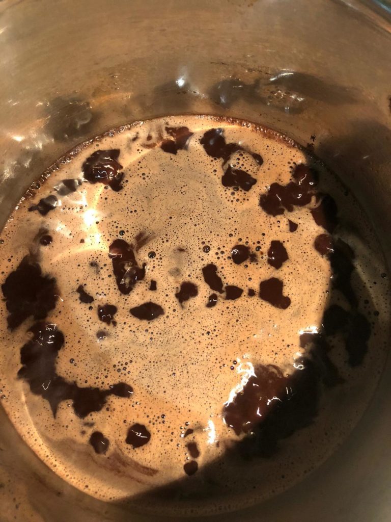 - Añade la mezcla de azúcar y cacao al agua y mantequilla que ya están hirviendo.
