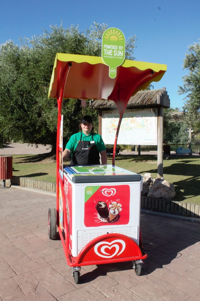 Los nuevos carritos solares son equipos híbridos. Durante el día funcionan mediante energía solar, y por la noche se recarga la batería de las neveras desde la red eléctrica para mantener el frío. Esto permite que los innovadores y sostenibles carritos de la compañía consuman una décima parte de energía, en comparación con las neveras convencionales (que deben estar conectadas a la electricidad las 24 horas).